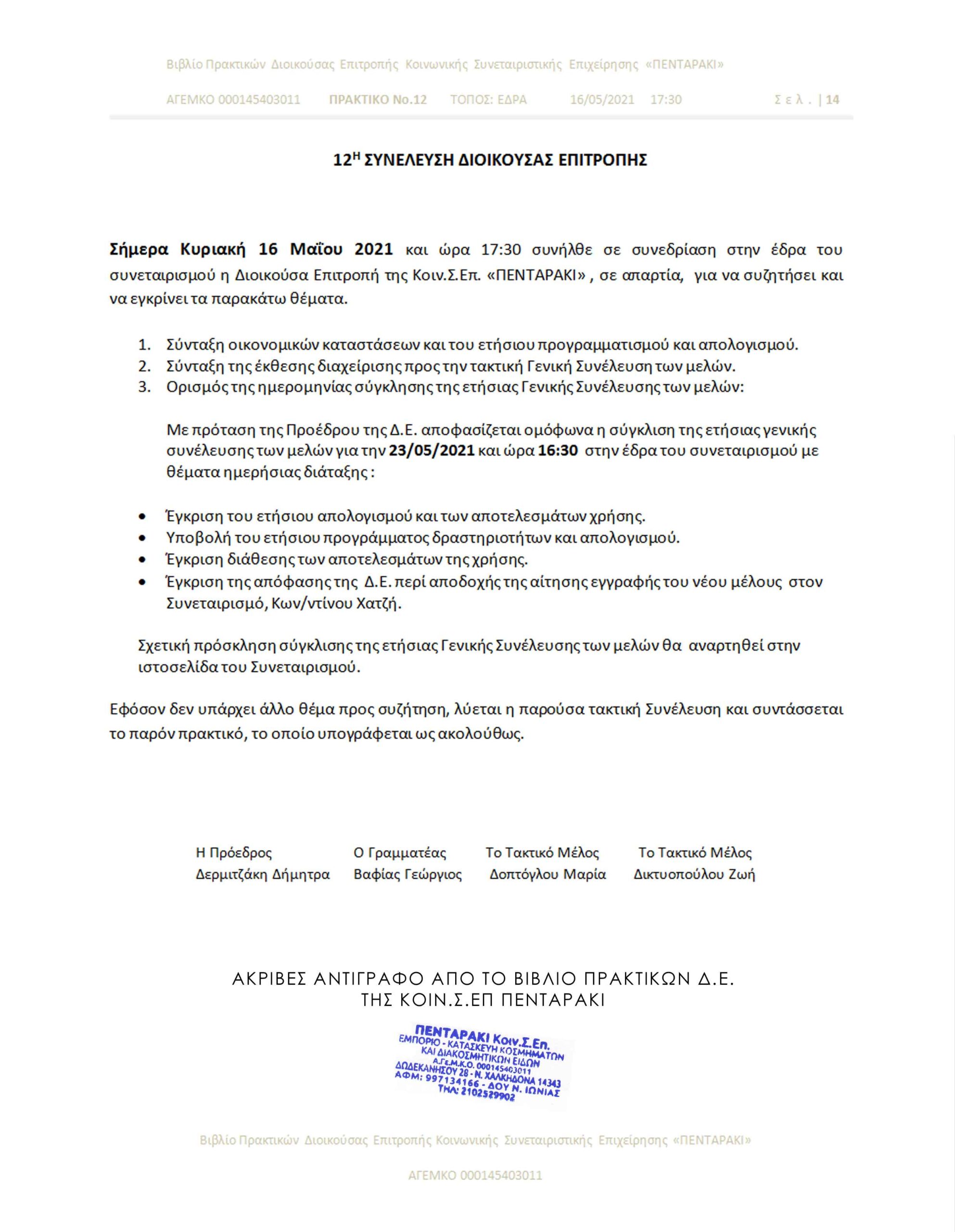 Την Κυριακή 16 Μαΐου 2021, συνήλθε σε συνεδρίαση στην έδρα του συνεταιρισμού η Δ.Ε. για τη σύνταξη των οικονομικών καταστάσεων του ετήσιου προγραμματισμού και απολογισμού, τη σύνταξη της έκθεσης διαχείρισης προς την Γ.Σ. των μελών και όρισε ημερομηνία σύγκλησης της ετήσιας Γενικής Συνέλευσης την Κυριακή 23/05/2021 και ώρα 16:30 στην έδρα του συνεταιρισμού με θέματα ημερήσιας διάταξης :